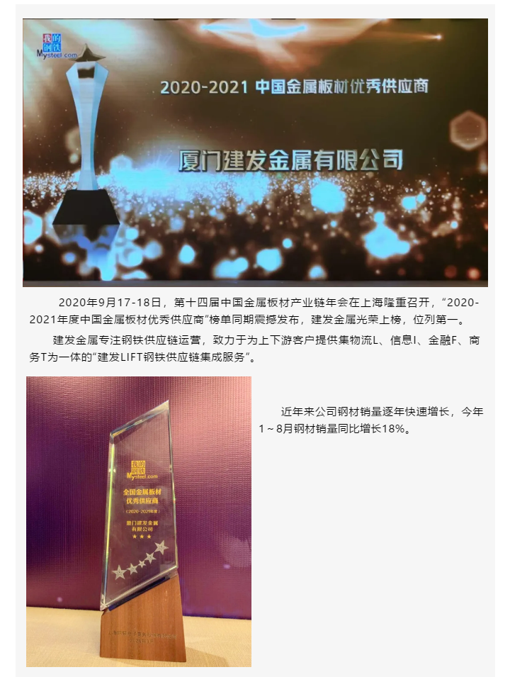 位列第一 | 建發(fā)金屬獲評(píng)“2020-2021年度中國(guó)金屬板材優(yōu)秀供應(yīng)商”